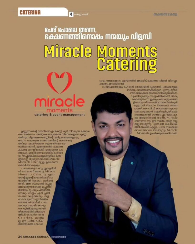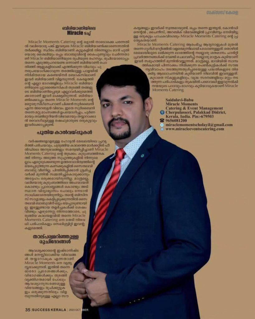 In the heart of Cherpulassery, Palakkad, Mr. Saidalavi Babu turned a small-town dream into one of Kerala’s most trusted catering and event brands Miracle Moments Catering & Event Management.